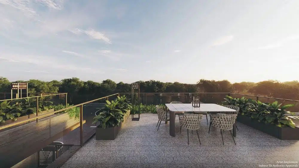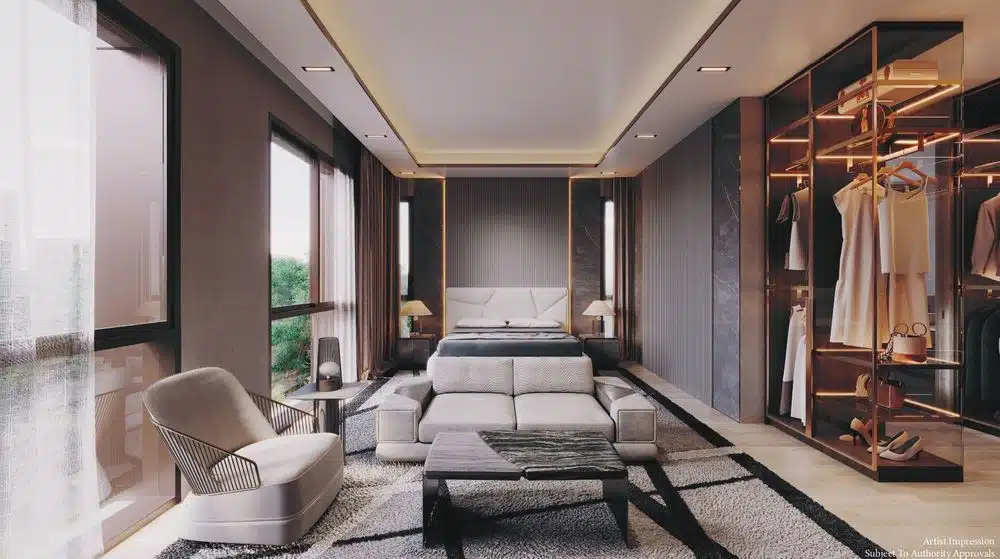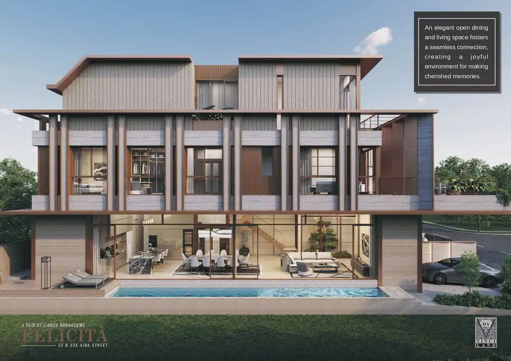 FELICITÀ—meaning happiness—reimagines the experience of landed living in the heart of Opera Estate. Conceived as a pair of architecturally expressive linked bungalows, each residence embodies Da Vinci Land’s philosophy that no two homes should ever feel ordinary. Defined by travertine marble fins, bronze-toned cladding, and sculptural lines, the façade reflects a quiet European refinement.