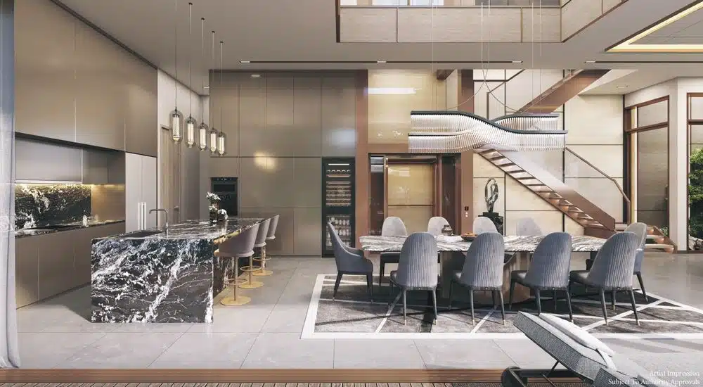 The living and dining areas rise dramatically through a double-height void, allowing natural light to cascade across marble floors and architectural wall cladding. The result is spatial clarity, openness, and visual connection across levels.